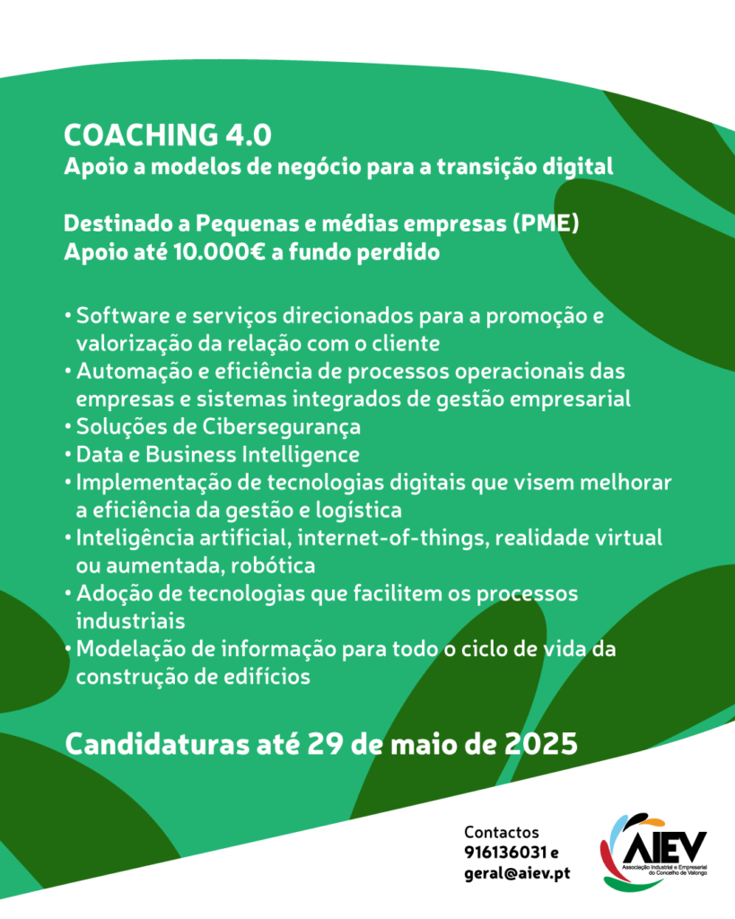 A medida Apoio a Modelos de Negócio para a Transição Digital (Coaching 4.0) integra o investimento 02 – Transição Digital das Empresas da componente 16 – Empresas 4.0 do Plano de Recuperação e Resiliência (PRR).