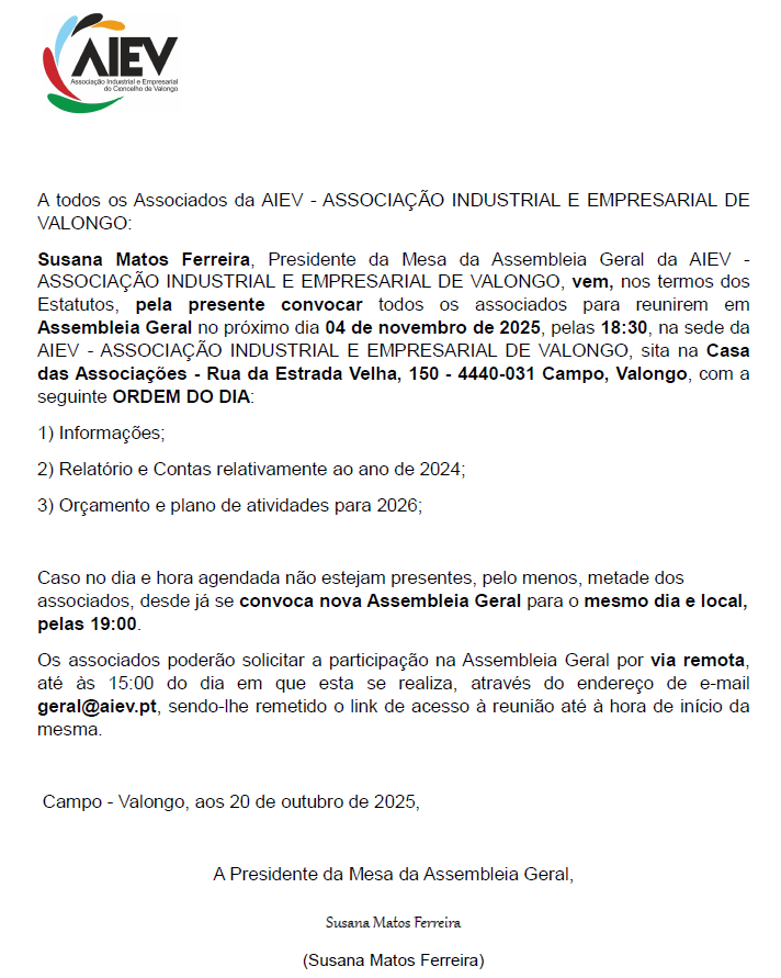 Convocatória: Assembleia Geral da AIEV – 04 Novembro 2025